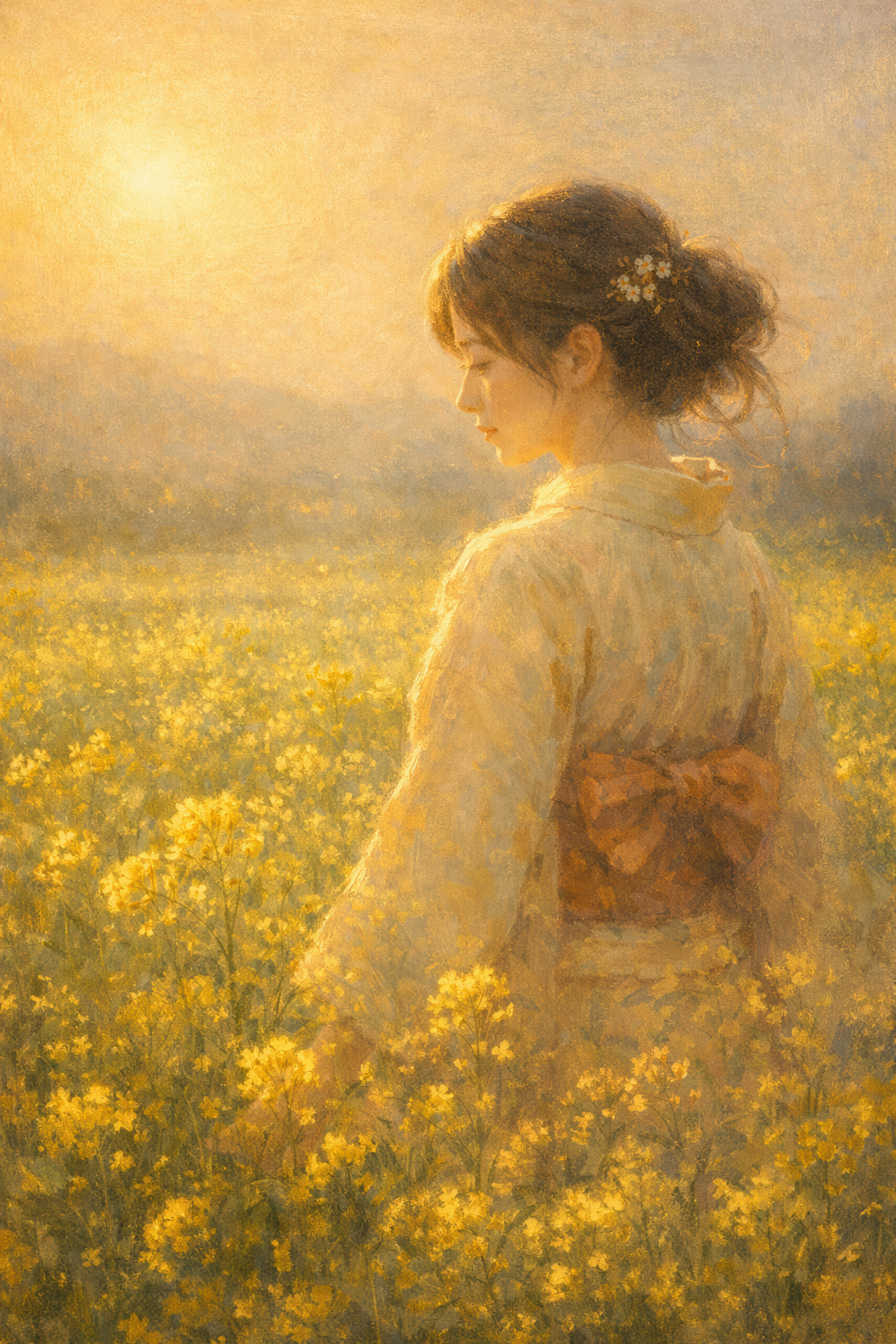 A woman standing quietly in a vast field of nanohana flowers.