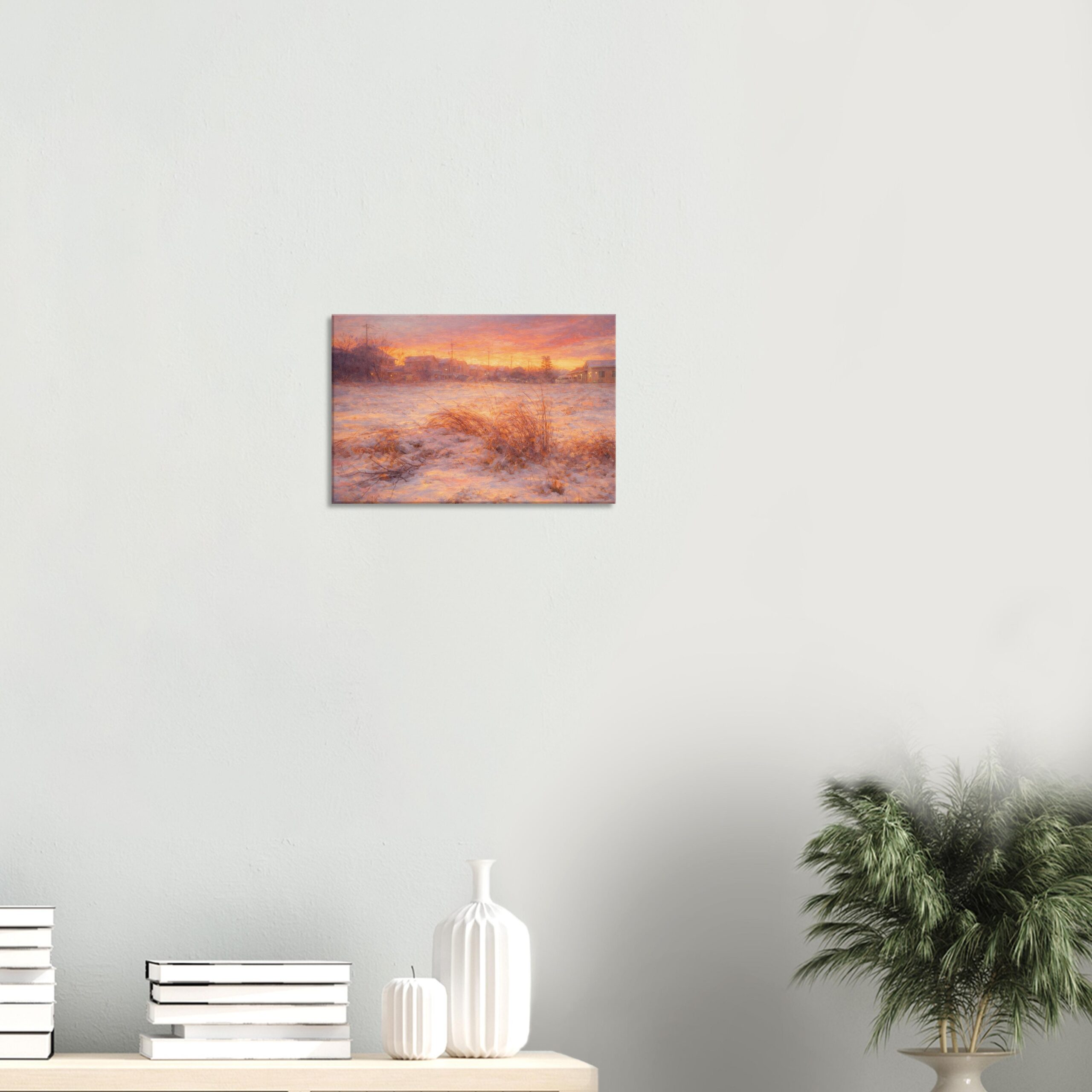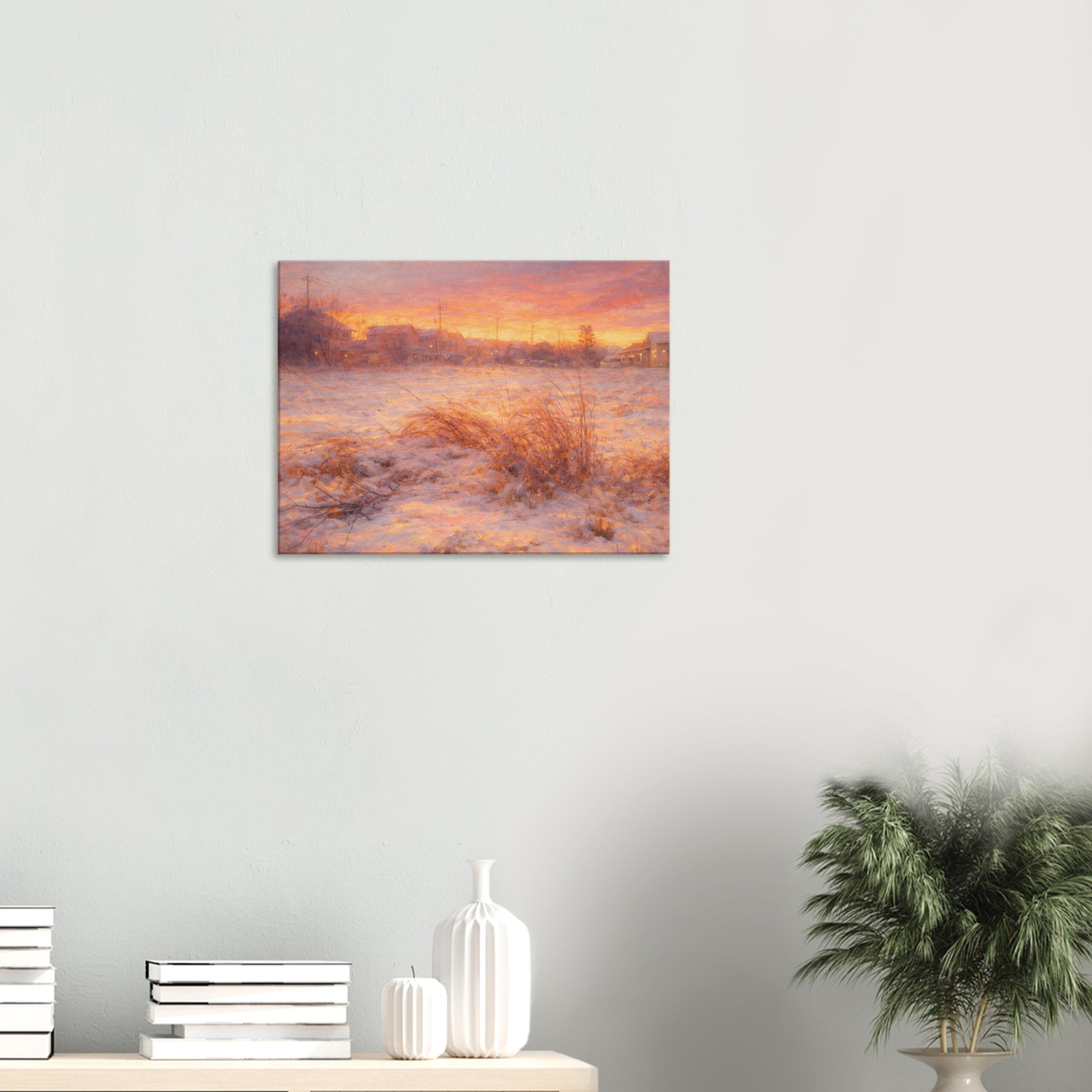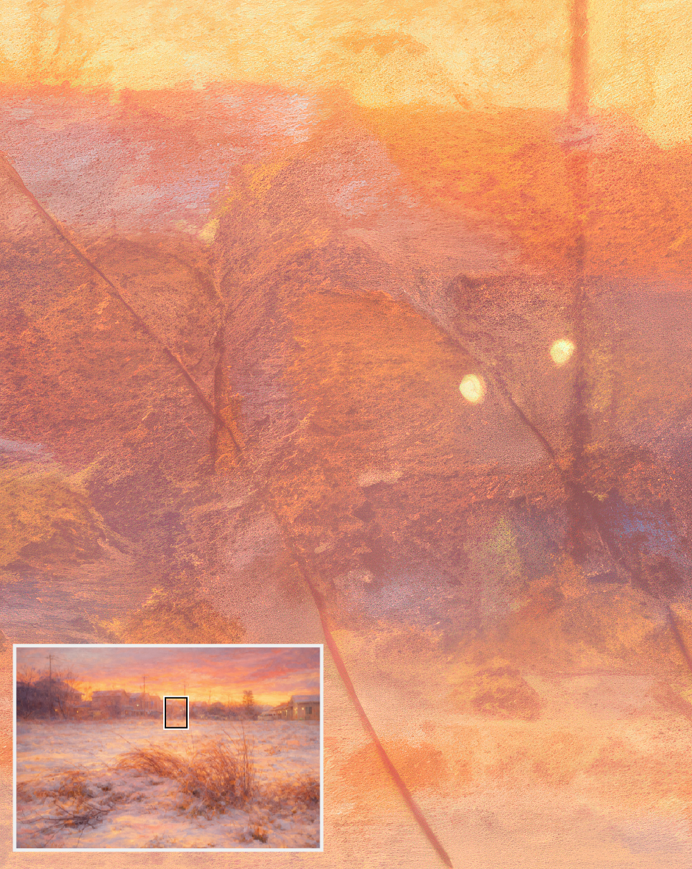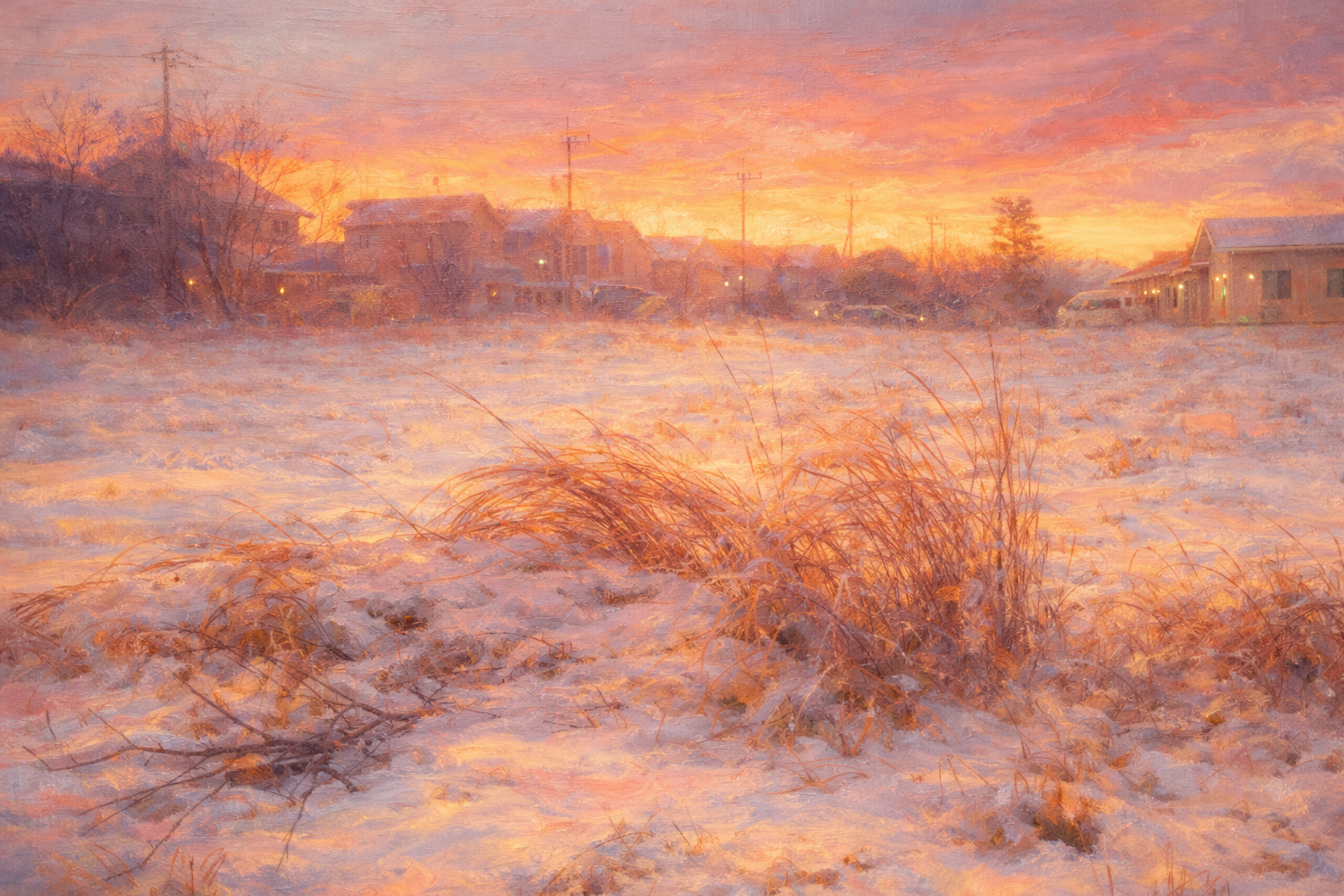 A quiet winter evening wrapped in snow. Warm afterlight gently melts the cold world into silence.